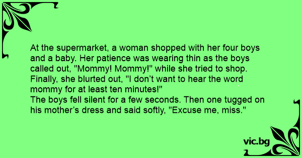 The boys fell silent for a few seconds. Then one tugged on his mother’s dress and said softly, "Excuse me, miss."