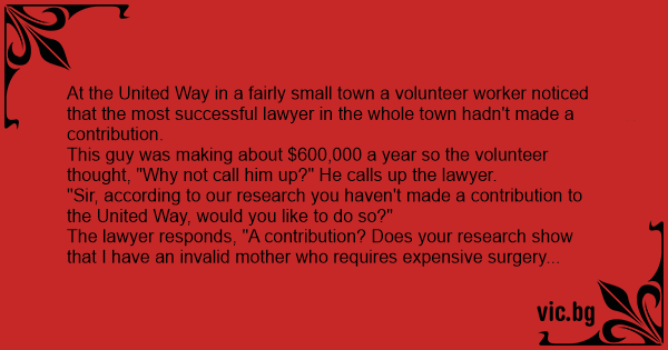The lawyer responds, "A contribution? Does your research show that I have an invalid mother who requires expensive surgery once a year just to stay alive?"