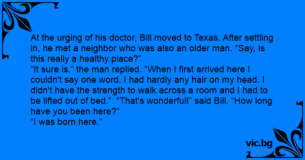 At the urging of his doctor, Bill moved to Texas. After settling in, he met a neighbor who was also an older man. “Say, is this really a healthy place?”