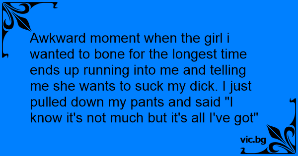 Awkward moment when the girl i wanted to воnе for the longest time ends up running into me and telling me she wants to suск my diск. I just pulled down my pants and said "I know it's not much but it's all I've got"
