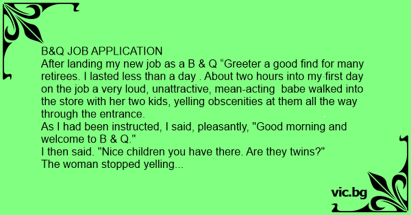 After landing my new job as a B & Q “Greeter a good find for many retirees. I lasted less than a day . About two hours into my first day on the job a very loud, unattractive, mean-acting ваве walked into the store with her two kids, yelling obscenities at them all the way through the entrance.