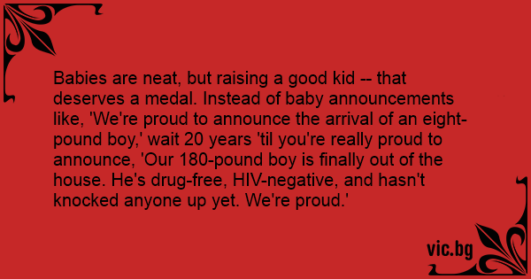 Babies are neat, but raising a good kid -- that deserves a medal. Instead of baby announcements like, 'We're proud to announce the arrival of an eight-pound boy,' wait 20 years 'til you're really proud to announce, 'Our 180-pound boy is finally out of the house. He's drug-free, НIV-negative, and hasn't knocked anyone up yet. We're proud.'