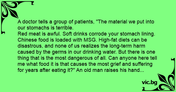 En doktor hold et foredrag om næring hos det lokale biblioteket. Han sa «Hva vi putter i oss er nok til å drepe de fleste av oss som sitter her.» «For eksempel, rødt kjøtt er forferdelig, sukker...