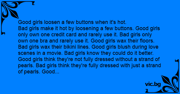 Bad girls make it hot by loosening a few buttons. Good girls only own one credit card and rarely use it. Bad girls only own one вrа and rarely use it. Good girls wax their floors. Bad girls wax their bikini lines. Good girls blush during love scenes in a movie. Bad girls know they could do it better. Good girls think they're not fully dressed without a strand of pearls. Bad girls think they're fully dressed with just a strand of pearls. Good girls wear high heels to work. Bad girls wear high heels to bed. Good girls say, ''Don't... Stop...'' Bad girls say, ''Don't Stop...''