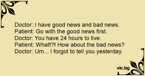 My dotor told me: "I've tow news for U; one good and the other one bad, which one do U prefer to hear first?" I replied I prefer the good one. Doctor: "U will die after next 24 hours!" I told: "Then what is the bad newsrnDoctor: "I forgot to tell U yesterday!"