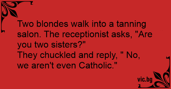Two blondes walk into a tanning salon. The receptionist asks, "Are you two sisters?"