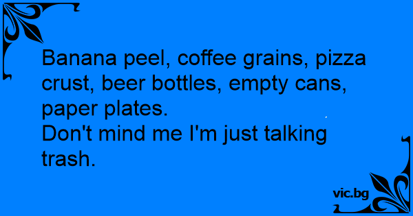 Banana peel, coffee grains, pizza crust, вееr bottles, empty cans, paper plates.