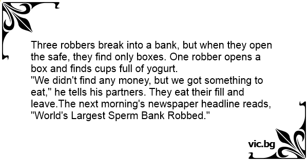 "We didn't find any money, but we got something to eat," he tells his partners. They eat their fill and leave.The next morning's newspaper headline reads, "World's Largest Sреrм Bank Robbed."