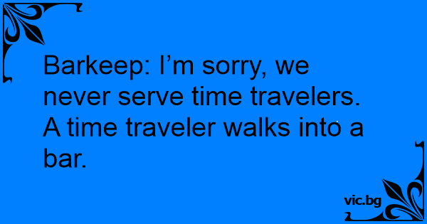 Barkeep: I’m sorry, we never serve time travelers. A time traveler walks into a bar.