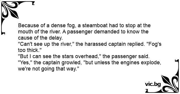 Because of a dense fog, a steamboat had to stop at the mouth of the river. A passenger demanded to know the cause of the delay. "Can't see up the river," the harassed captain replied. "Fog's too thick." "But I can see the stars overhead," the passenger said. "Yes," the captain growled, "but unless the engines explode, we're not going that way."