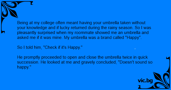 Being at my college often meant having your umbrella taken without your knowledge and if lucky returned during the rainy season. So I was pleasantly surprised when my roommate showed me an umbrella and asked me if it was mine. My umbrella was a brand called "Happy".
