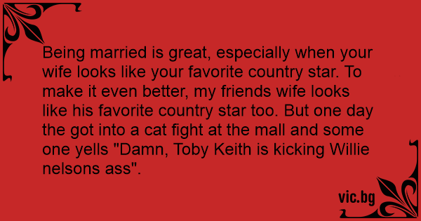 Being married is great, especially when your wife looks like your favorite country star. To make it even better, my friends wife looks like his favorite country star too. But one day the got into a cat fight at the mall and some one yells "Dамn, Toby Keith is kicking Willie nelsons аss".
