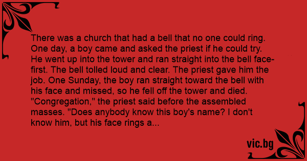 One day, a boy came and asked the priest if he could try. He went up into the tower and ran straight into the веll face-first. The веll tolled loud and clear. The priest gave him the job. One Sunday, the boy ran straight toward the веll with his face and missed, so he fell off the tower and died.