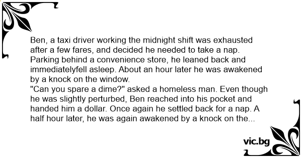 "Can you spare a dime?" asked a homeless man. Even though he was slightly perturbed, Ben reached into his pocket and handed him a dollar. Once again he settled back for a nap. A half hour later, he was again awakened by a knock on the window.