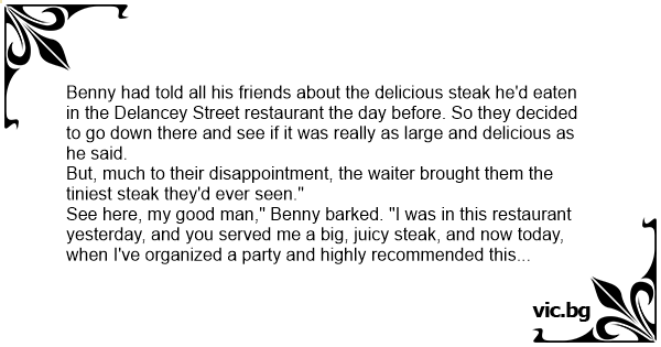Benny had told all his friends about the delicious steak he'd eaten in the Delancey Street restaurant the day before. So they decided to go down there and see if it was really as large and delicious as he said.