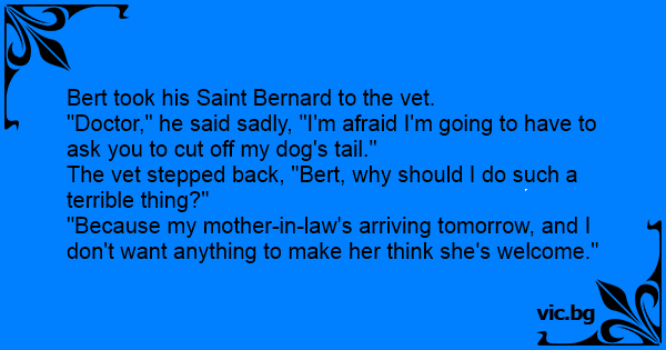 Hørt hos dyrlægen: - Vil de ikke nok skære hele halen af min hund? - Hvorfor dog det? - Min svigermor kommer på besøg, og hun må absolut ikke se tegn på at hun er velkommen!