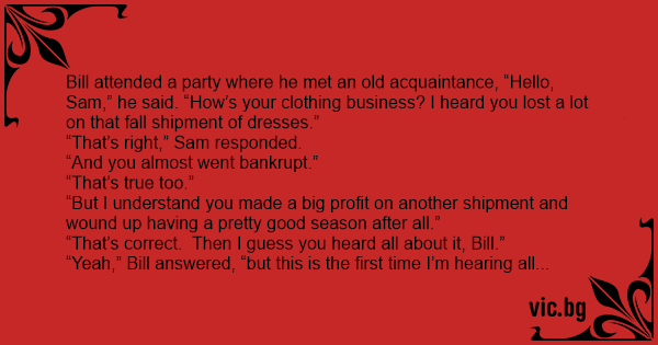 Bill attended a party where he met an old acquaintance, “Hello, Sam,” he said. “How’s your clothing business? I heard you lost a lot on that fall shipment of dresses.”