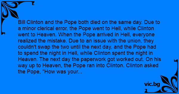 O Papa e o Clinton morreram e foram para o céu. No dia seguinte eles se encontram e o Papa confessa a Clinton: — Não vejo a hora de encontrar a Virgem Maria! — IIhh! Acho que agora é tarde!