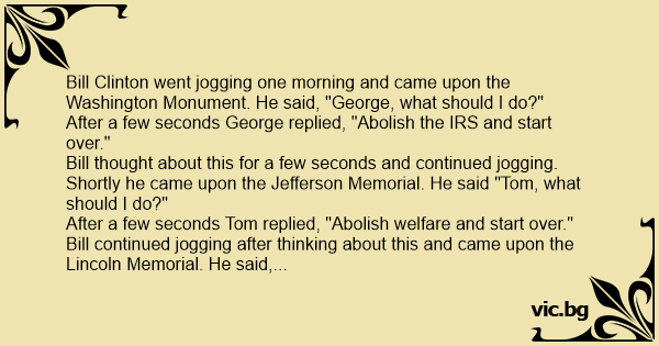 Bill Clinton went jogging one morning and came upon the Washington Monument. He said, "George, what should I do?"
