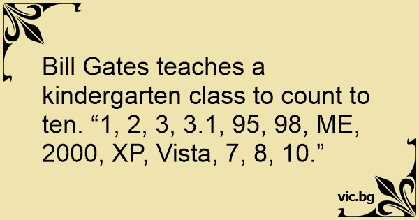 Bill Gates teaches a kindergarten class to count to ten. “1, 2, 3, 3.1, 95, 98, ME, 2000, XP, Vista, 7, 8, 10.”