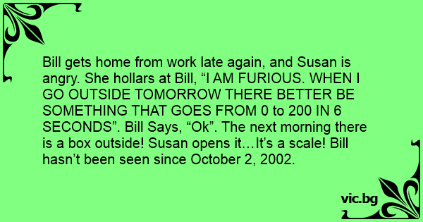 Bill gets home from work late again, and Susan is angry. She hollars at Bill, “I AM FURIOUS. WHEN I GO OUTSIDE TOMORROW THERE BETTER BE SOMETHING THAT GOES FROM 0 to 200 IN 6 SECONDS”. Bill Says, “Ok”. The next morning there is a box outside! Susan opens it…It’s a scale! Bill hasn’t been seen since October 2, 2002.