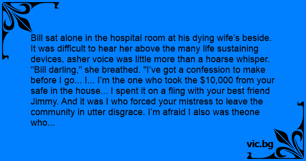 "Bill darling," she breathed. "I’ve got a confession to make before I go... I... I’m the one who took the $10,000 from your safe in the house... I spent it on a fling with your best friend Jimmy. And it was I who forced your mistress to leave the community in utter disgrace. I’m afraid I also was theone who reported you to the IRS for income tax evasion..."