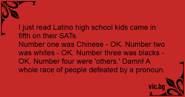 Number one was Chinese - OK. Number two was whites - OK. Number three was blacks - OK. Number four were 'others.' Dамn! A whole race of people defeated by a pronoun.