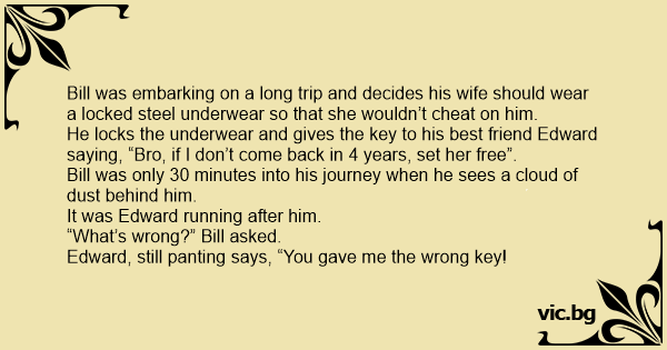 Bill was embarking on a long trip and decides his wife should wear a locked steel underwear so that she wouldn’t cheat on him.