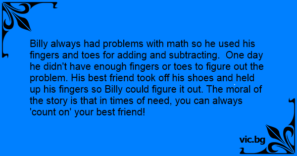 Billy always had problems with math so he used his fingers and toes for adding and subtracting. One day he didn't have enough fingers or toes to figure out the problem. His best friend took off his shoes and held up his fingers so Billy could figure it out. The moral of the story is that in times of need, you can always 'count on' your best friend!