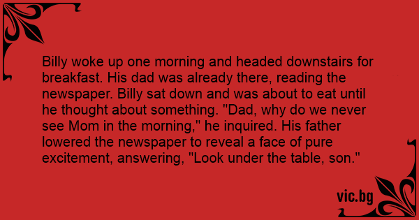 Billy woke up one morning and headed downstairs for breakfast. His dad was already there, reading the newspaper. Billy sat down and was about to eat until he thought about something. "Dad, why do we never see Mom in the morning," he inquired. His father lowered the newspaper to reveal a face of pure excitement, answering, "Look under the table, son."