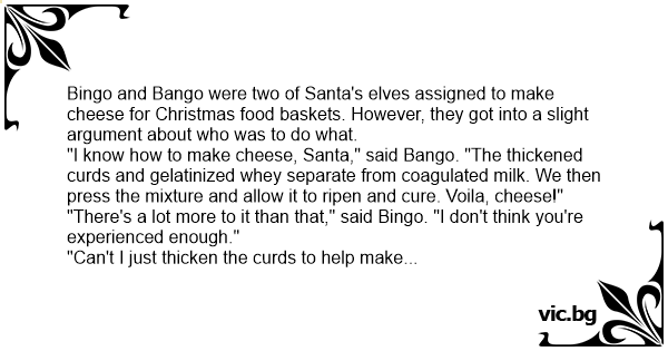 Bingo and Bango were two of Santa's elves assigned to make cheese for Christmas food baskets. However, they got into a slight argument about who was to do what.
