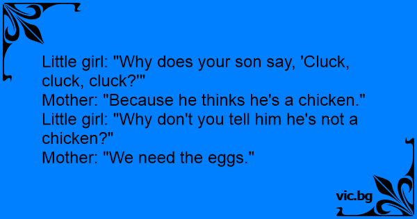 Little girl: "Why does your son say, 'Cluck, cluck, cluck?'"