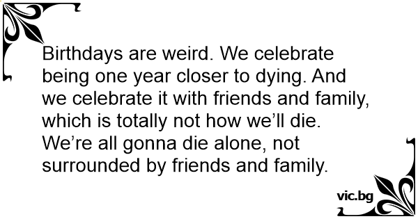 Birthdays are weird. We celebrate being one year closer to dying. And we celebrate it with friends and family, which is totally not how we’ll die.