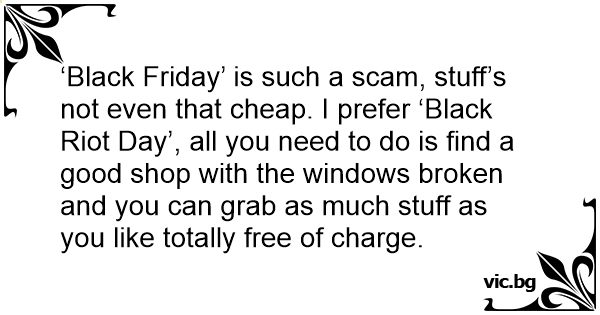 ‘Black Friday’ is such a scam, stuff’s not even that cheap. I prefer ‘Black Riot Day’, all you need to do is find a good shop with the windows broken and you can grab as much stuff as you like totally free of charge.