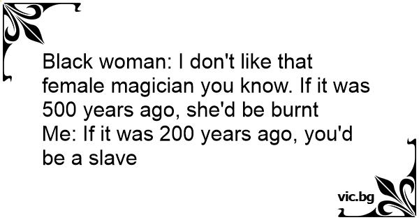 Black woman: I don't like that female magician you know. If it was 500 years ago, she'd be burnt