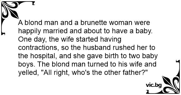 One day, the wife started having contractions, so the husband rushed her to the hospital, and she gave birth to two baby boys. The blond man turned to his wife and yelled, "All right, who's the other father?"