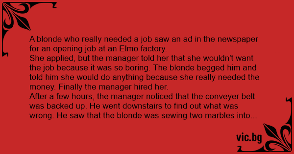 A blonde who really needed a job saw an ad in the newspaper for an opening job at an Elmo factory.