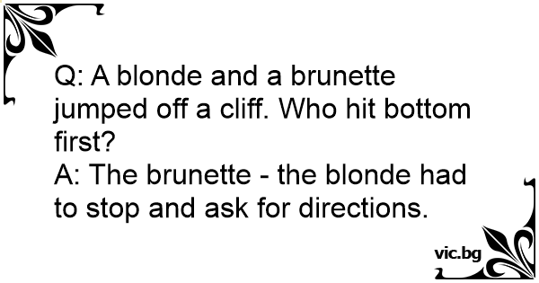 Ερώτηση: Εάν μια μελαχρινή και μια ξανθιά πέσουν από ένα κτήριο ποια θα φτάσει πρώτη κάτω? Απάντηση: Η μελαχρινή – η ξανθιά θα σταματήσει στο δρόμο για οδηγίες