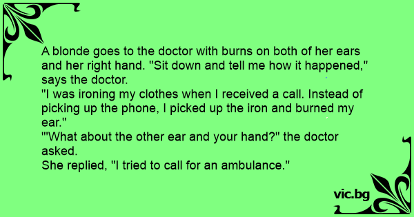 Білявка з обпеченими вухами приходить до лікаря. — Що трапилось? — запитує лікар. — Переглядала по телевізору серіал, праску вимкнути забула, а вона, як на зло, стояла поряд із телефоном. Коли...