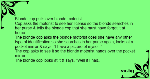 The blonde cop asks the blonde motorist does she have any other type of identification so she searches in her purse again, looks at a pocket mirror & says, "I have a picture of myself."