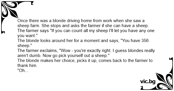 Jede přebarvená blondýnka na kole a potká baču se stádem ovcí. V dobrém rozmaru navrhne: „Když ti povím, kolik máš přesně ovcí, dáš mi jednu?” Bača souhlasí. Exblondýnka mu to řekne, strefí se a...