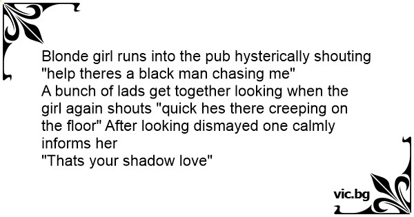 Blonde girl runs into the pub hysterically shouting "help theres a black man chasing me"