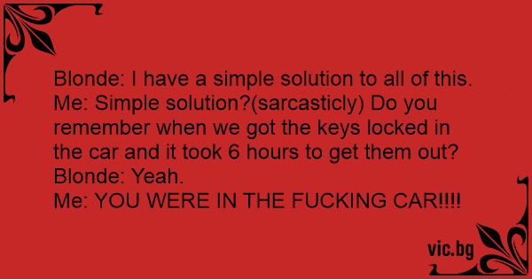 Me: Simple solution?(sarcasticly) Do you remember when we got the keys locked in the car and it took 6 hours to get them out?