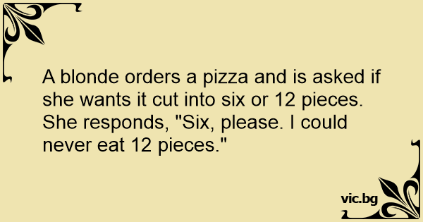 Blondýnka si objednala pizzu. Číšník se ptá: „Chcete ji rozřezat na šest, nebo na dvanáct kousků?” „Na šest,” odpoví rychle zákaznice. „Dvanáct bych jich nikdy nesnědla!”