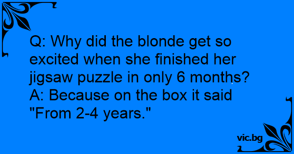 - Vet du varför blondinen var så stolt när hon lagt färdigt pusslet? - Nej. - För det tog henne bara en månad att bygga färdigt det, på kartongen stod det 1 till 2 år.