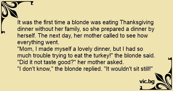 It was the first time a blonde was eating Thanksgiving dinner without her family, so she prepared a dinner by herself. The next day, her mother called to see how everything went.