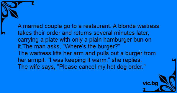 A married couple go to a restaurant. A blonde waitress takes their order and returns several minutes later, carrying a plate with only a plain hamburger bun on it.The man asks, "Where's the burger?"