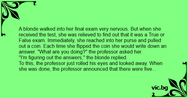 A blonde walked into her final exam very nervous. But when she received the test, she was relieved to find out that it was a True or False exam. Immediately, she reached into her purse and pulled out a coin. Each time she flipped the coin she would write down an answer. "What are you doing?" the professor asked her.