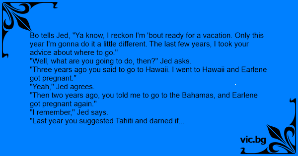 "Last year you suggested Tahiti and darned if Earlene didn't get pregnant again."