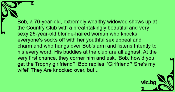 Bob, a 70-year-old, extremely wealthy widower, shows up at the Country Club with a breathtakingly beautiful and very sеxy 25-year-old blonde-haired woman who knocks everyone's socks off with her youthful sеx appeal and charm and who hangs over Bob's arm and listens Intently to his every word. His buddies at the club are all aghast. At the very first chance, they corner him and ask, 'Bob, how'd you get the Trophy girlfriend?' Bob replies, 'Girlfriend? She's my wife!' They Are knocked over, but continue to ask. 'So, how'd you persuade her to Marry you?'